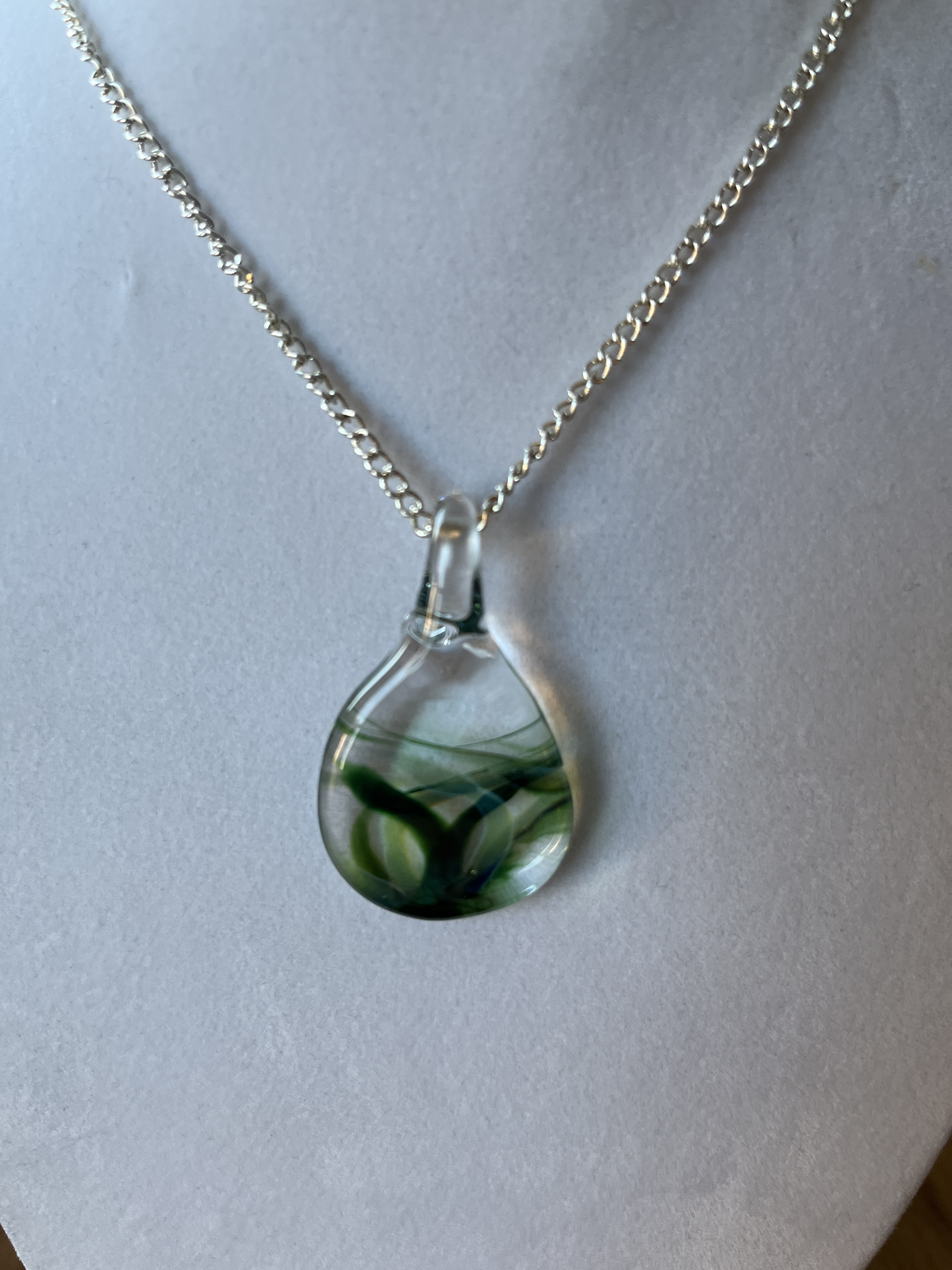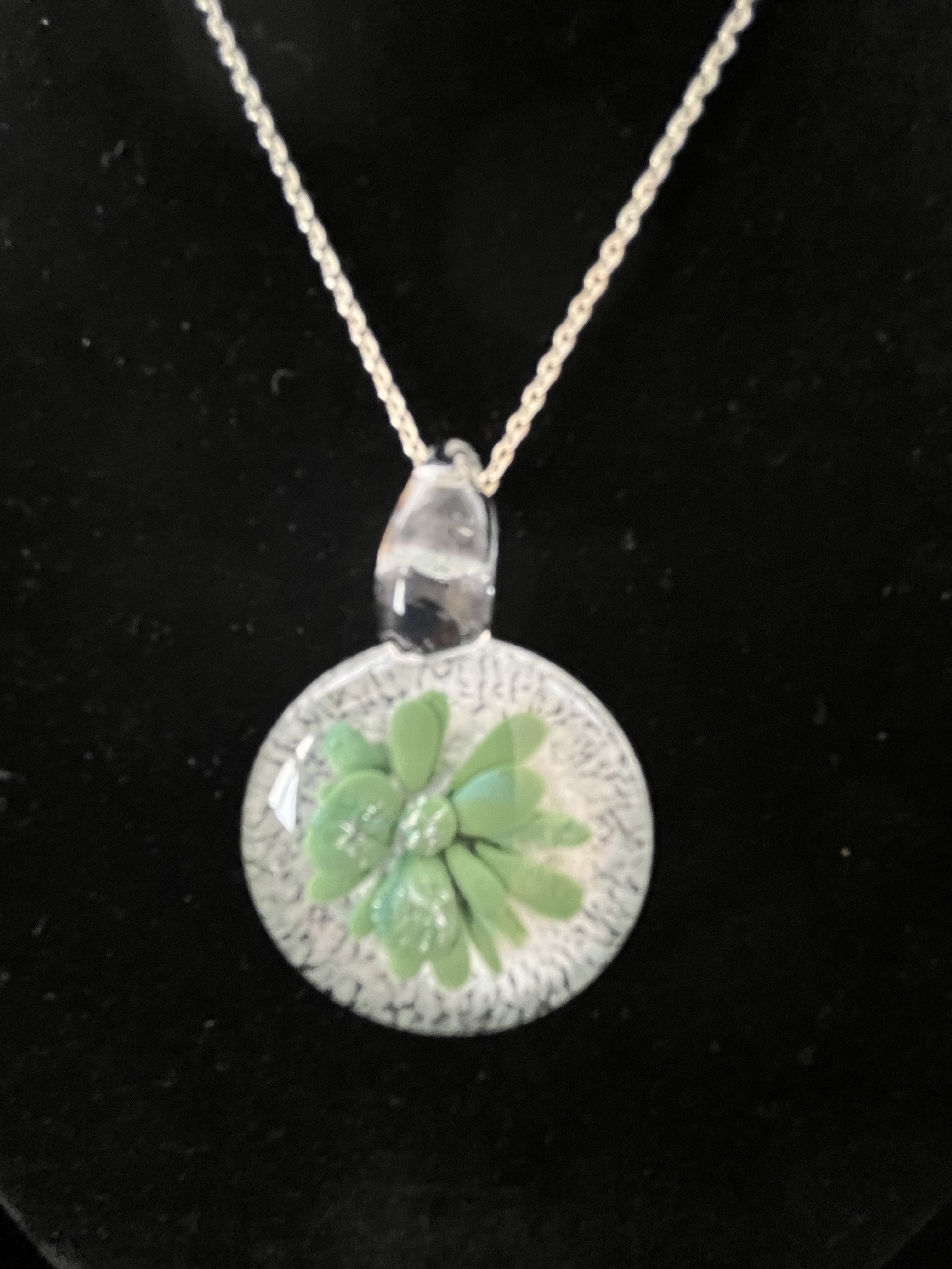 Green and white blossom pendant 1.75″H (includes bail)x1.13”W(chain included) $36