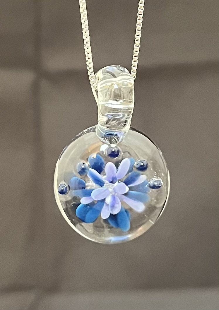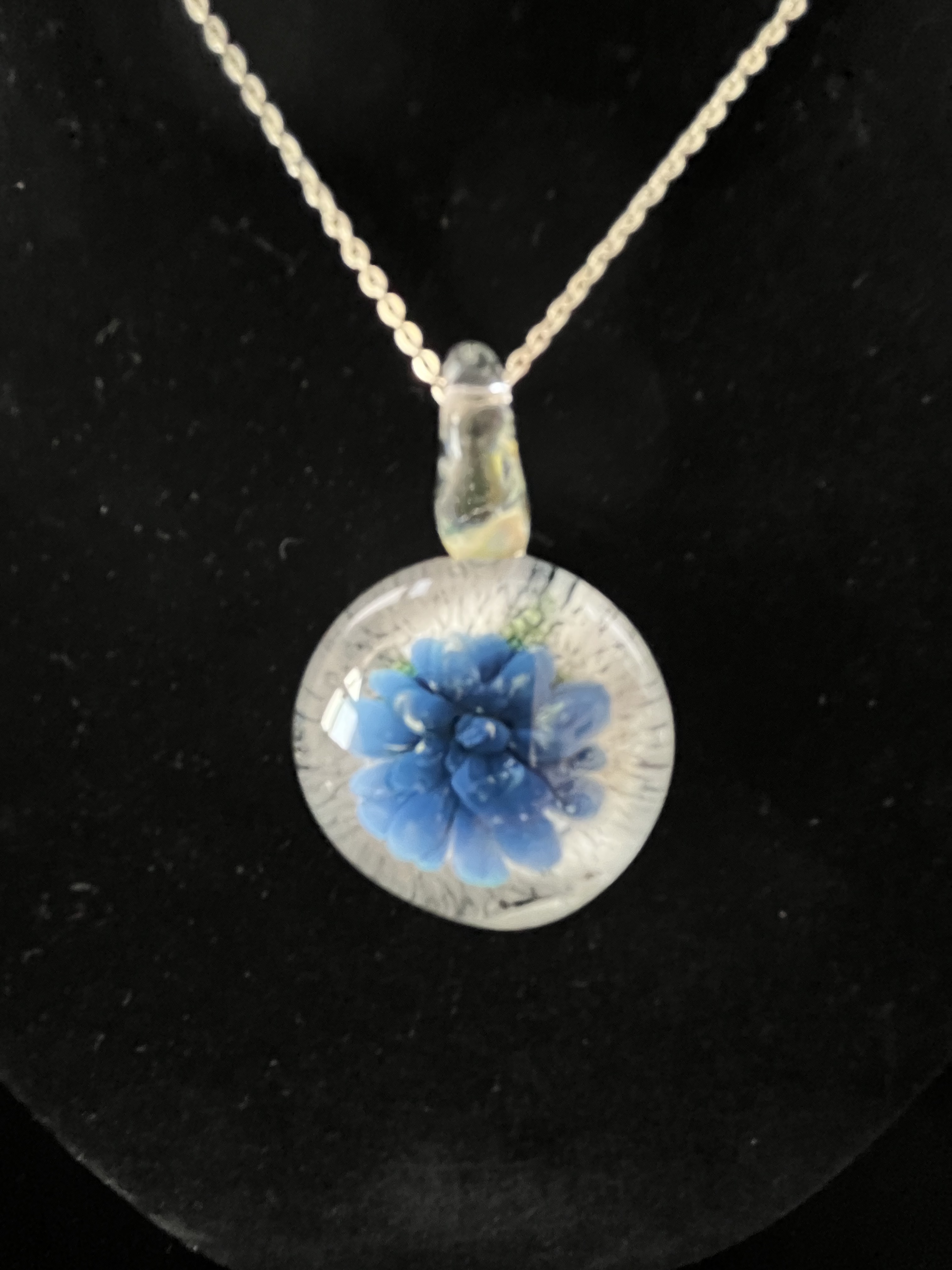 Blue and white blossom pendant 1.88″H (includes bail) x1.25”W (chain included) $36