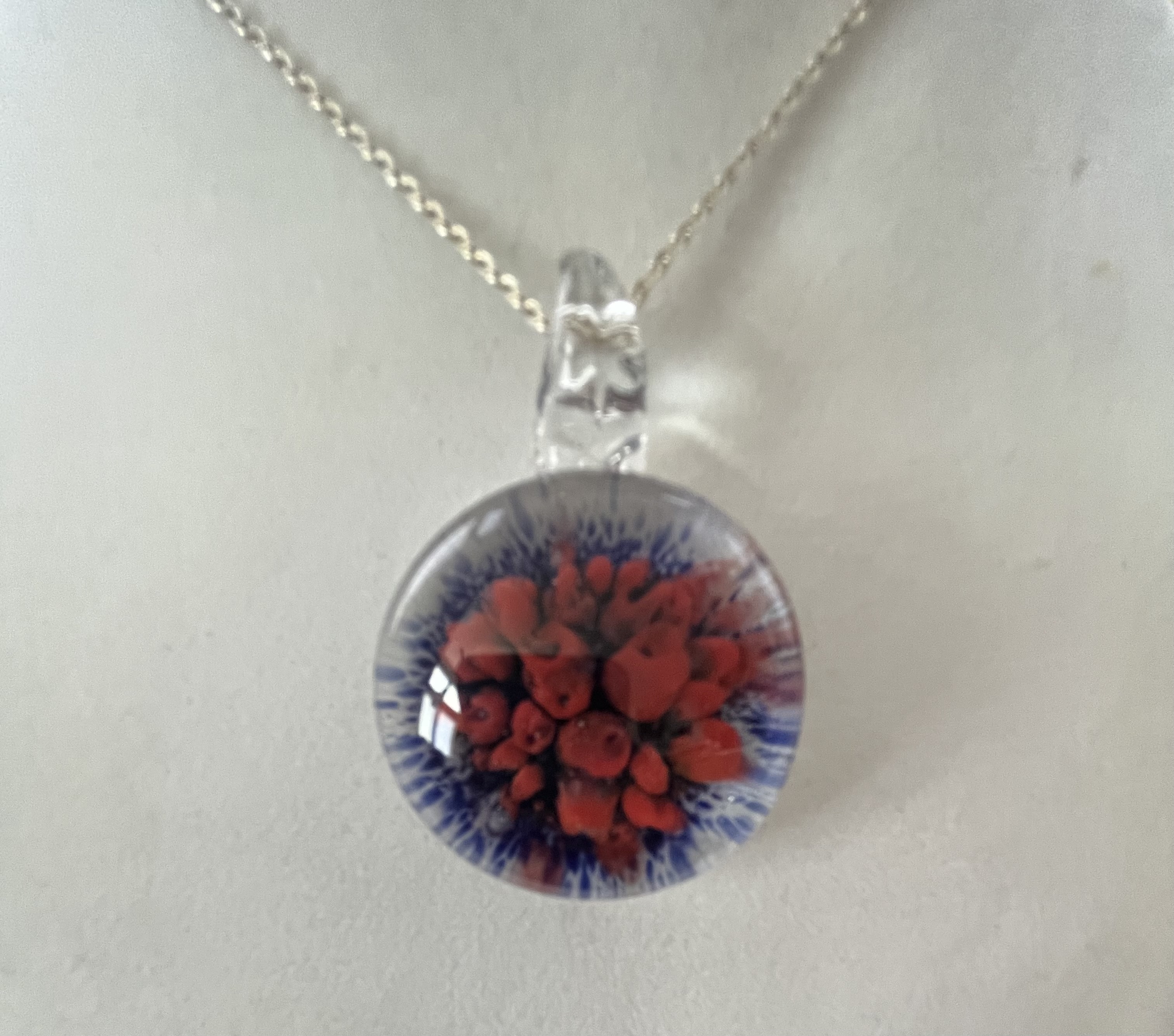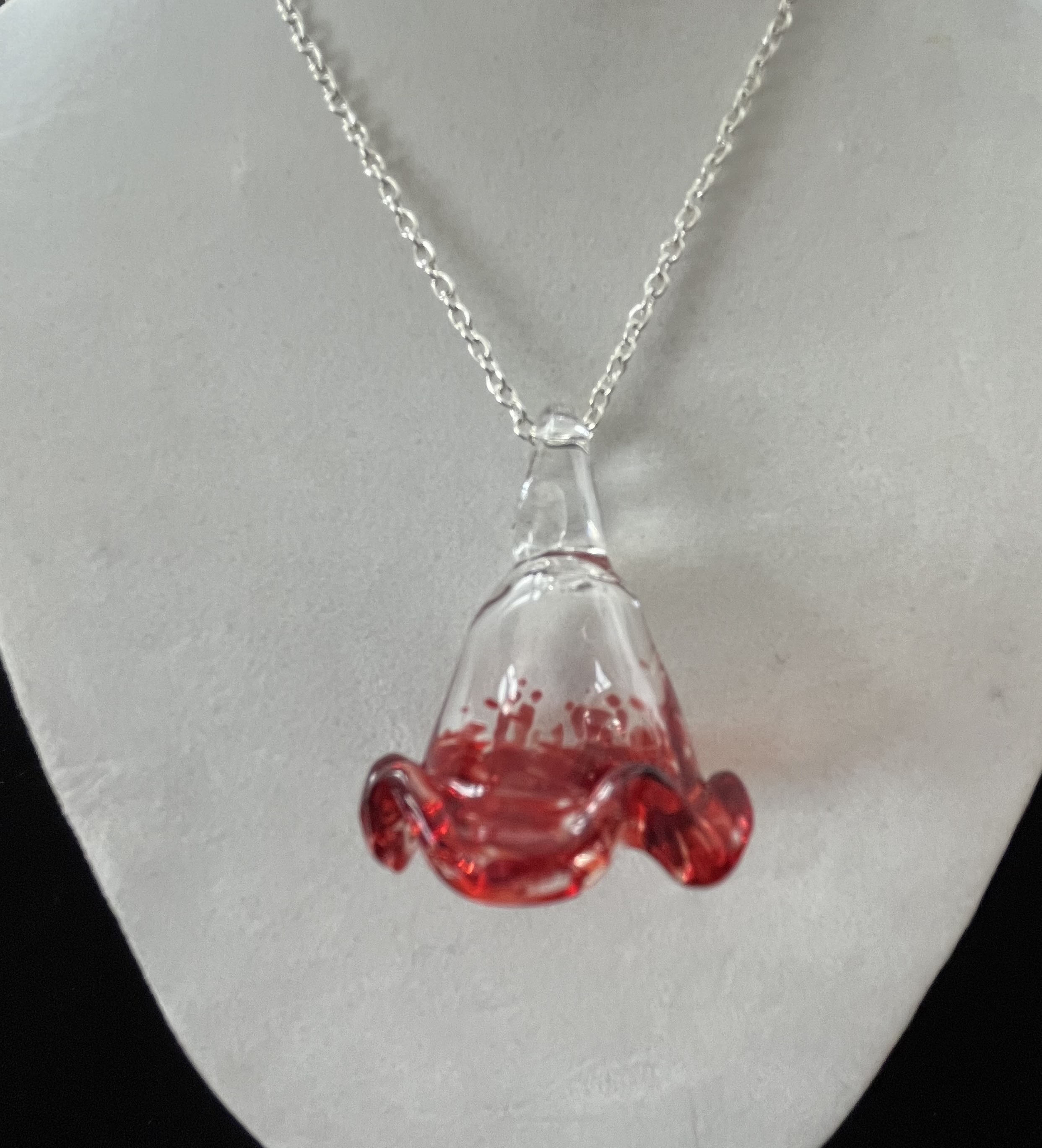 Red and blue blossom pendant 1.75″H(includes bale) x1.25”W (chain included) Sold