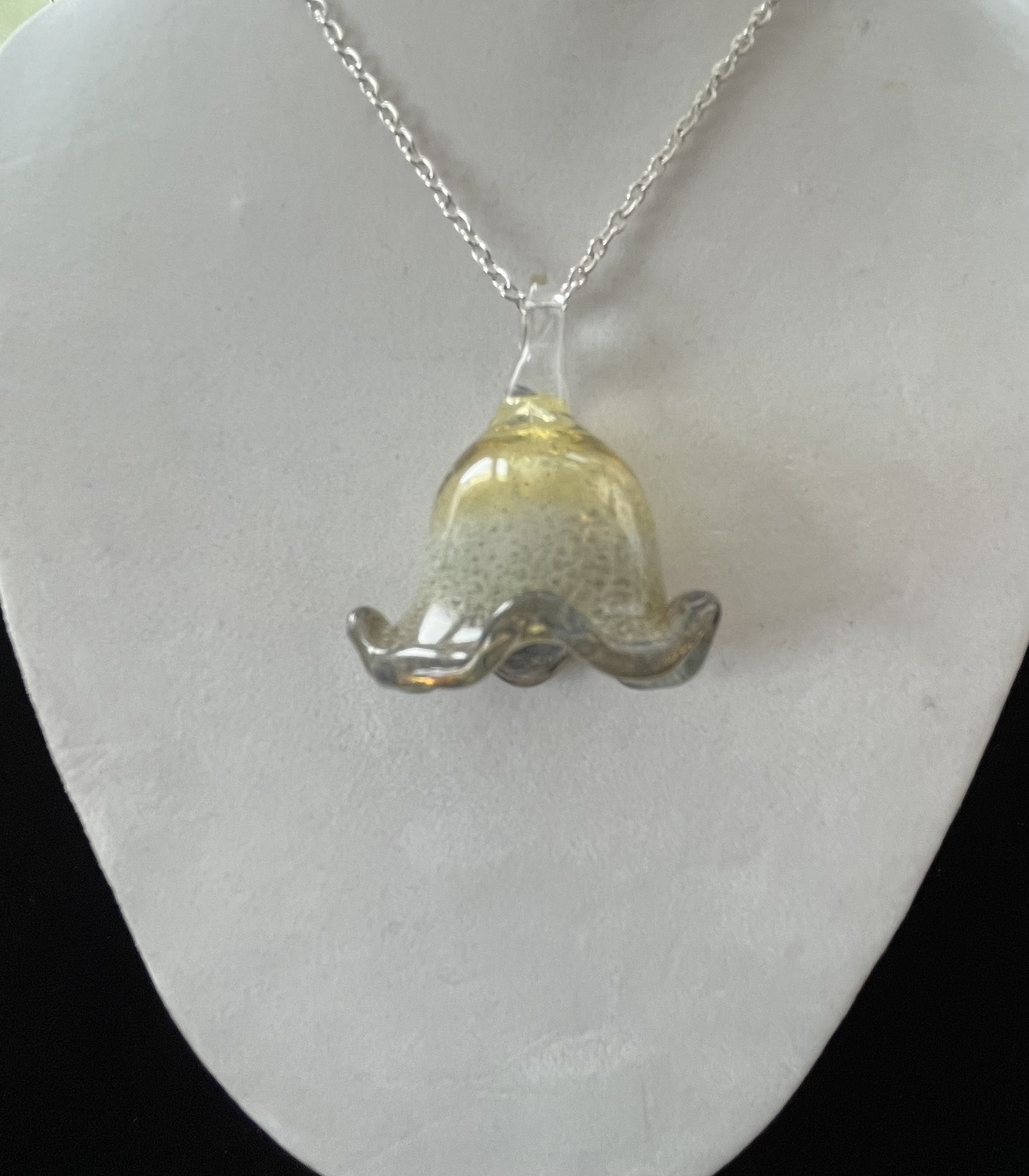 Yellow and White Blossom pendant 1.75″H (includes bail) x1.25” W)(chain included) $36