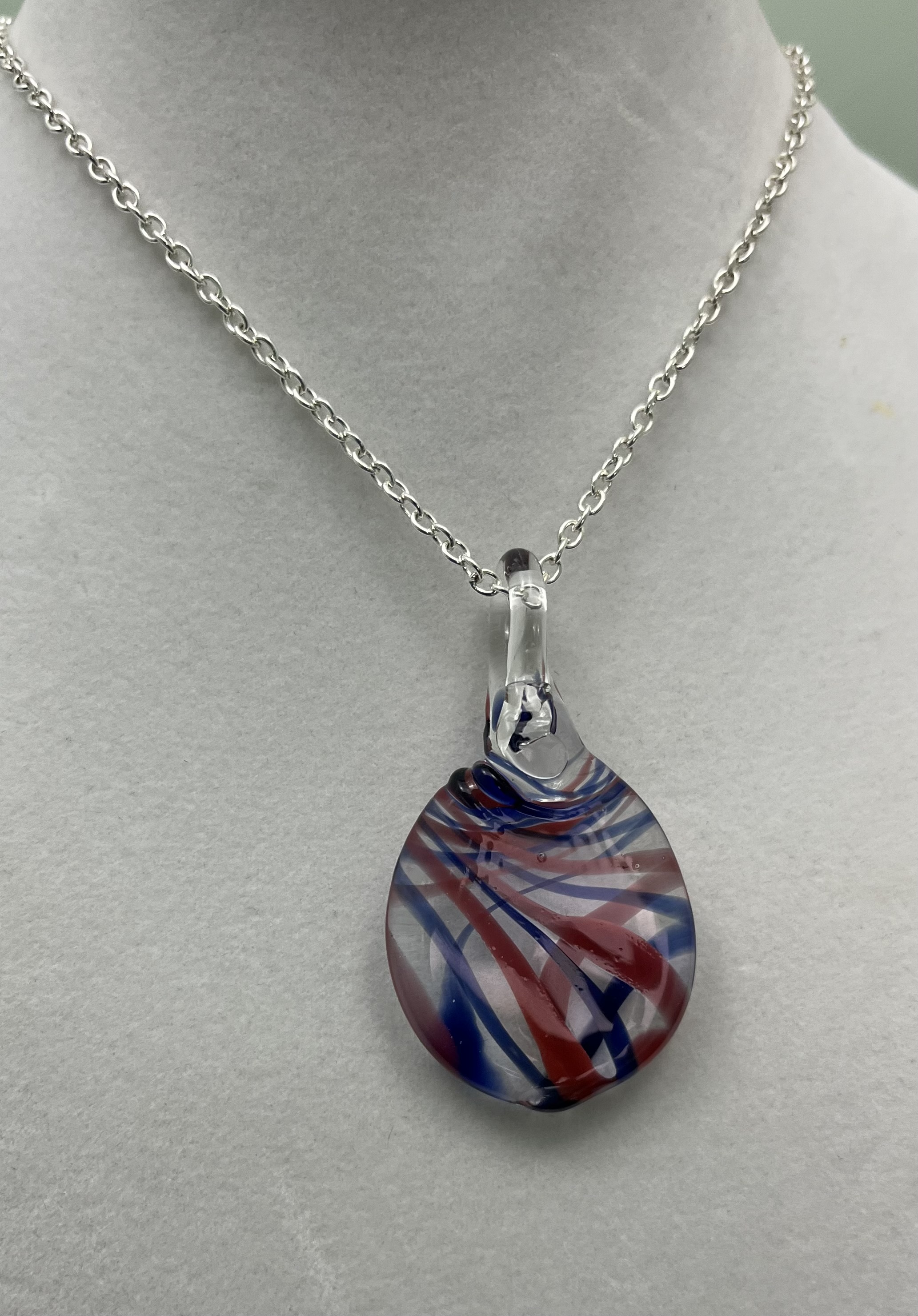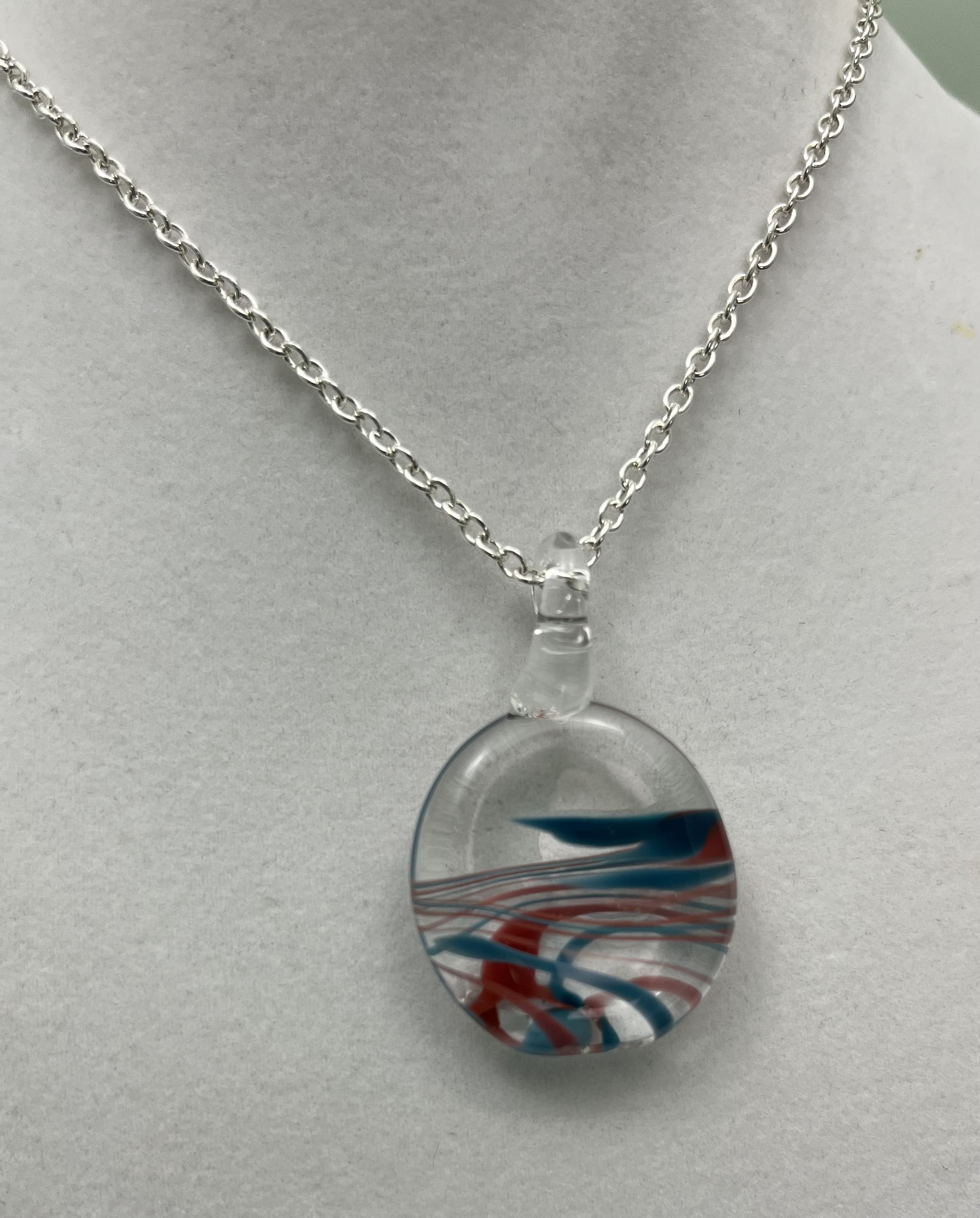 Red and blue abstract pendant 1.63″H (includes bail)x1.0”W (chain included) $29