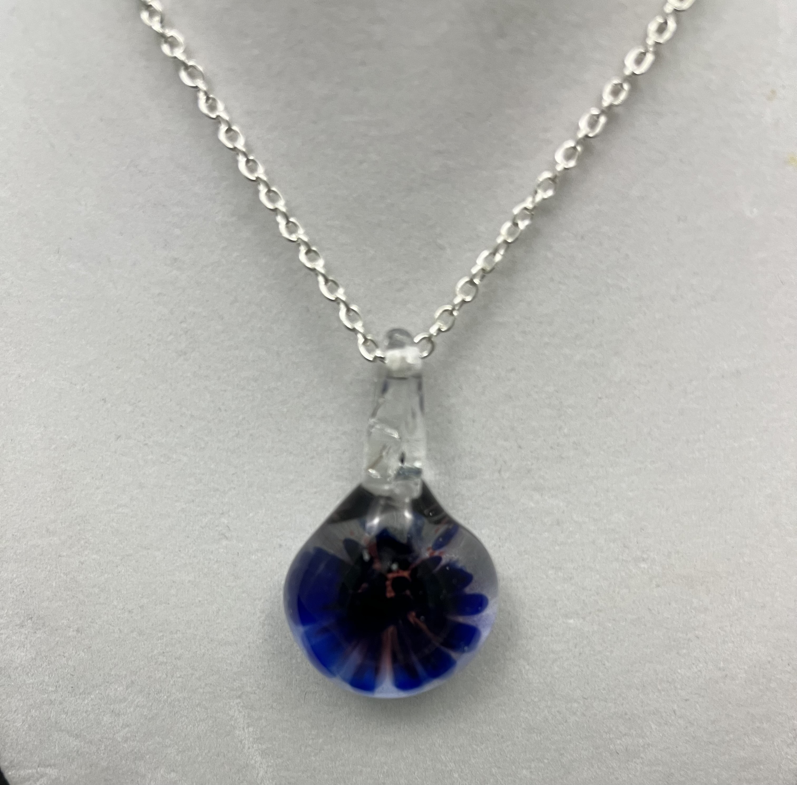 Blue and red blossom pendant 1.63″H (includes bail)x1″W (chain included)$35